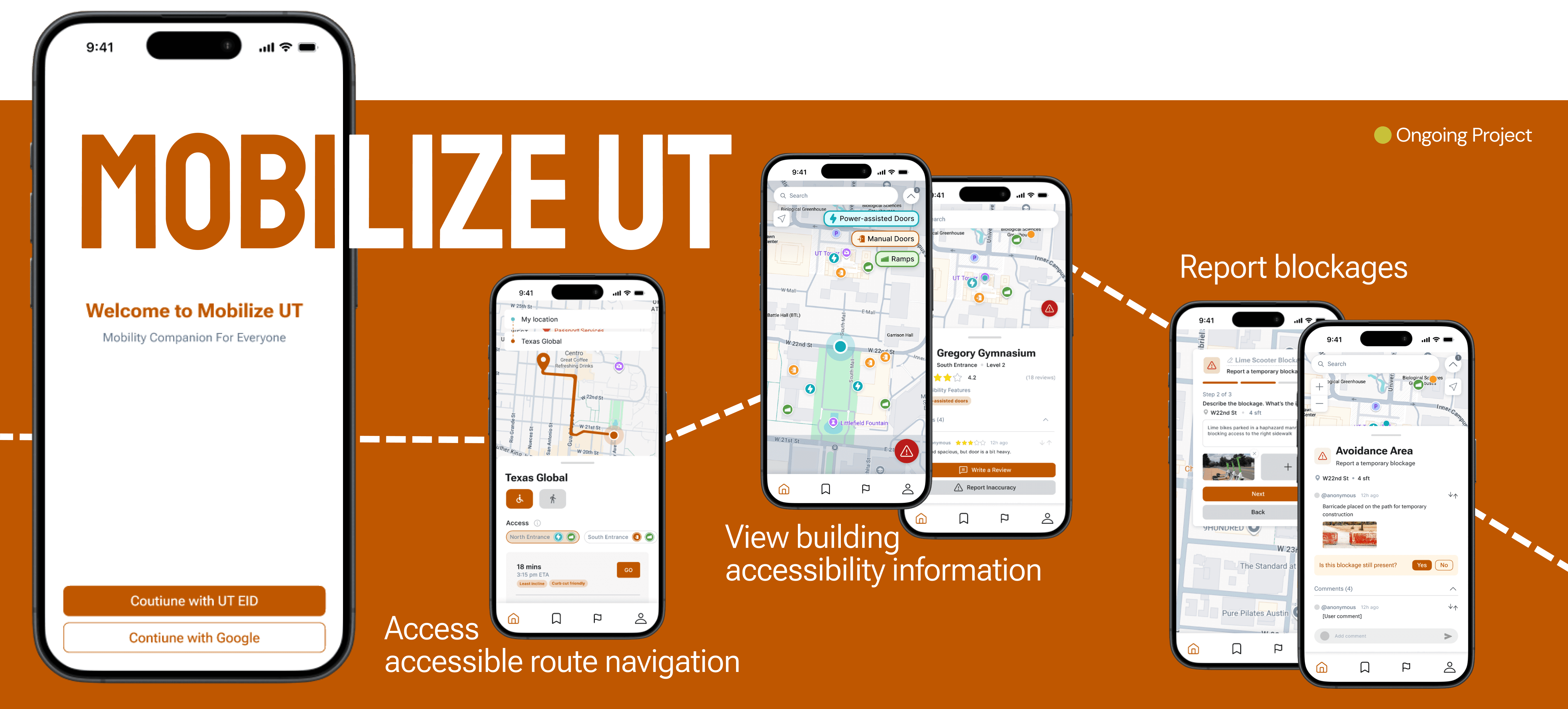 Mobilize UT displays accessibility maps, up-to-date building entrance information, and elevator statuses. The app also has a “report blockage” feature for students to report temporary blockages, allowing students to support one another when planning navigation routes.